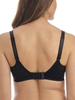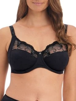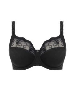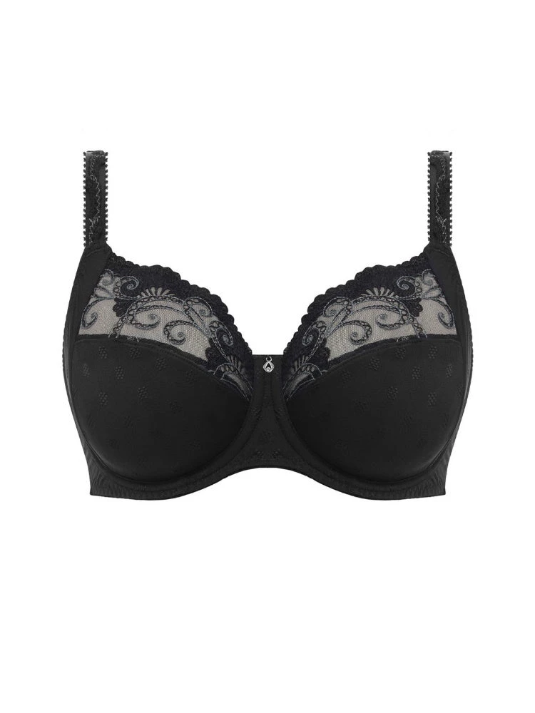 The Jocelyn range by Fantasie, based on the best-selling Fantasie Jacqueline range. Featuring a three-piece cup in Black, wide wired bra for additional comfort and support. The Nouveau inspired Austrian embroidery adorns the top cup. The concealed seams in the inner cup are combined with soft seamless spot design fabric. Its finished with embroidery on the shoulder straps with a metallic trim and diamante at the centre front.