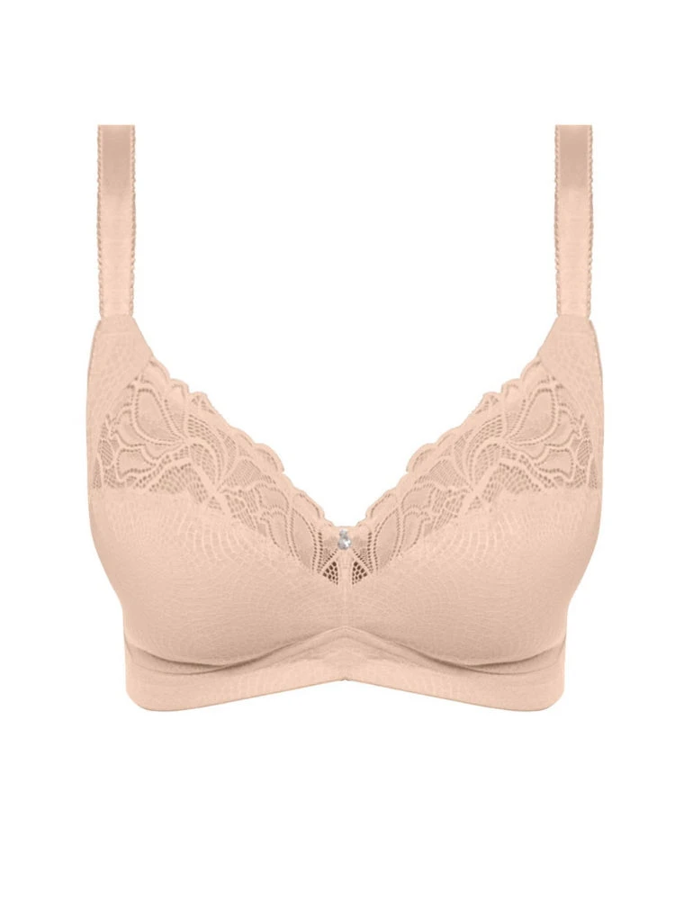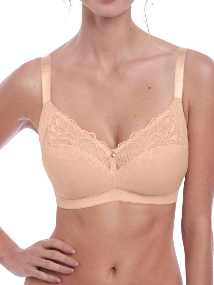 Fantasie’s Memoir Soft Cup Bra is a Natural Beige, with dramatic lace that adorns the top cup. The bra offers support and security without the need of an underwire, making it an essential for everyday comfort.