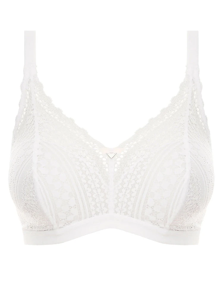 Freya Daisy Lace bralette in White. This non-wired bralette has a triangle shape with high apex style. Complete with a hook and eye fastening for support. The bow and silver triangle embellishment adds a cute feminine touch. A comfortable sweet bralette perfect for everyday wear.