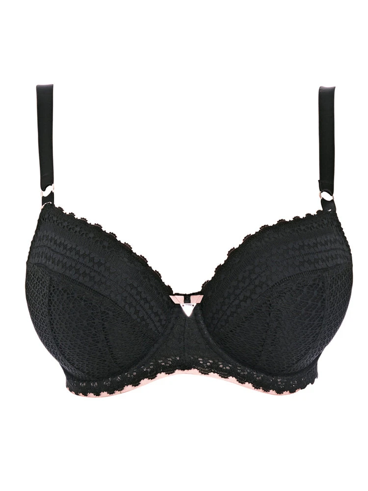 Freya Daisy Lace Balcony Half Cup bra in colour Noir is a perfect bra for everyday comfort. This charming padded bra features multi part cups which provides support and a natural shape to the bust. The bra boasts a stunning geometric lace with adjustable satin straps and a cute satin bow in the centre. A romantically chic bra which is perfect for your everyday lingerie collection!