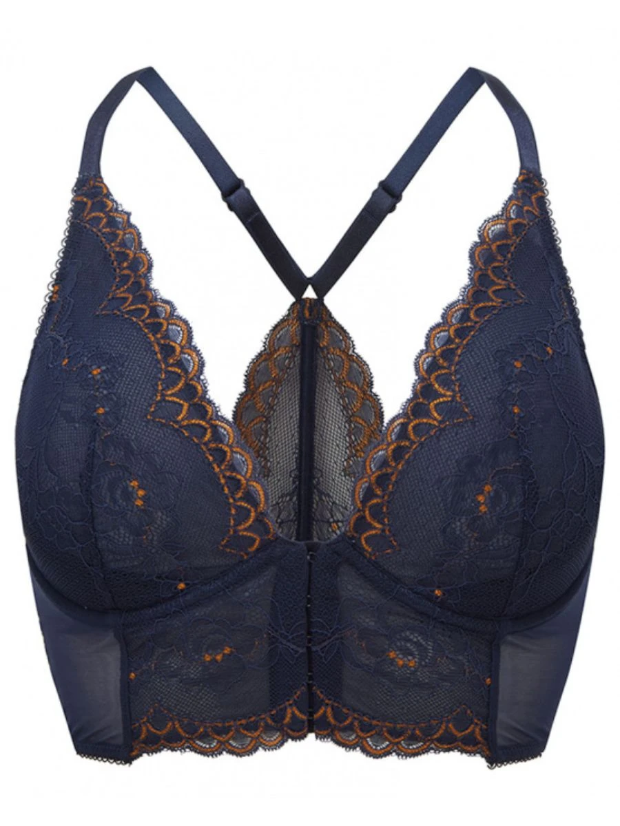 Fashioned from beautiful corded stretch lace is Gossard’s Superboost Lace Deep V Bralette in Midnight Blue/Gold.