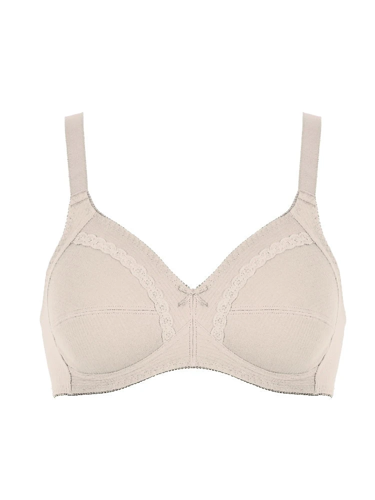 Soft Cup Cotton Bra from Naturana, in Light Beige. Made with comfort as a priority, this bra is made from 100% cotton. The non-padded full cups give a natural shape, and support cup sizes from A-E.